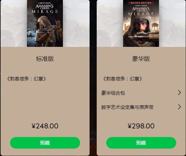《刺客信条:幻景》标准版售价248元,预购解锁奖励任务“四十大盗”。注意:特惠内容可能随时变更。预购特典内容可在任何时候由育碧自行决定是否开放购买及/或作为赠品单独提供。