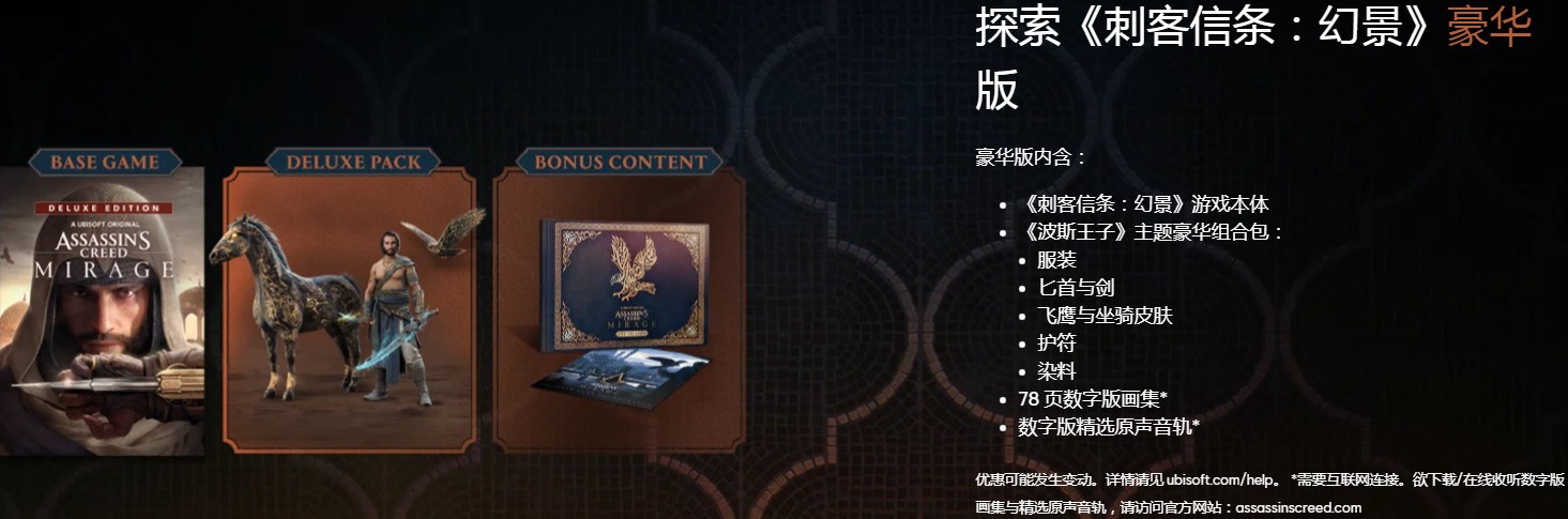 《刺客信条:幻景》豪华版售价298元,豪华版包含游戏本体,《波斯王子》主题豪华组合包:服装,匕首与剑,飞鹰与坐骑皮肤,护符,染料。78 页数字版画集,数字版精选原声音轨。