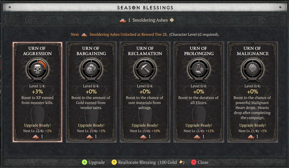 《暗黑破坏神4》第一赛季“恶疫赛季”中,玩家可以名为“闷热余烬”的通行证奖励资源来解锁和升级各种赛季祝福。