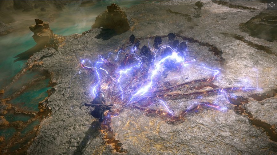 另一个例子则是“电击”技能宝石,可以通过镶嵌更多技能宝石将数个技能链接在一起。在释放该技能电击一些小怪后,后续技能会造成巨大的破坏。