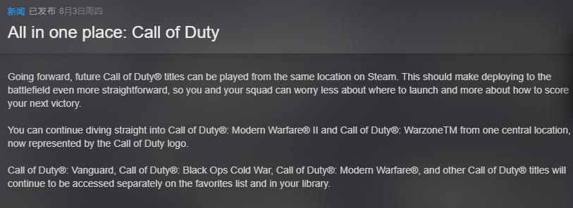 今日(8月3日),动视官方于Steam及战网平台发布公告宣布《使命召唤:现代战争2》和《战区》全部更名为《使命召唤》,未来使命召唤游戏可在同一标题下游玩,此外,《使命召唤:先锋》、《使命召唤:黑色行动冷战》、《守望先锋:现代战争》等使命召唤游戏仍可单独游玩。