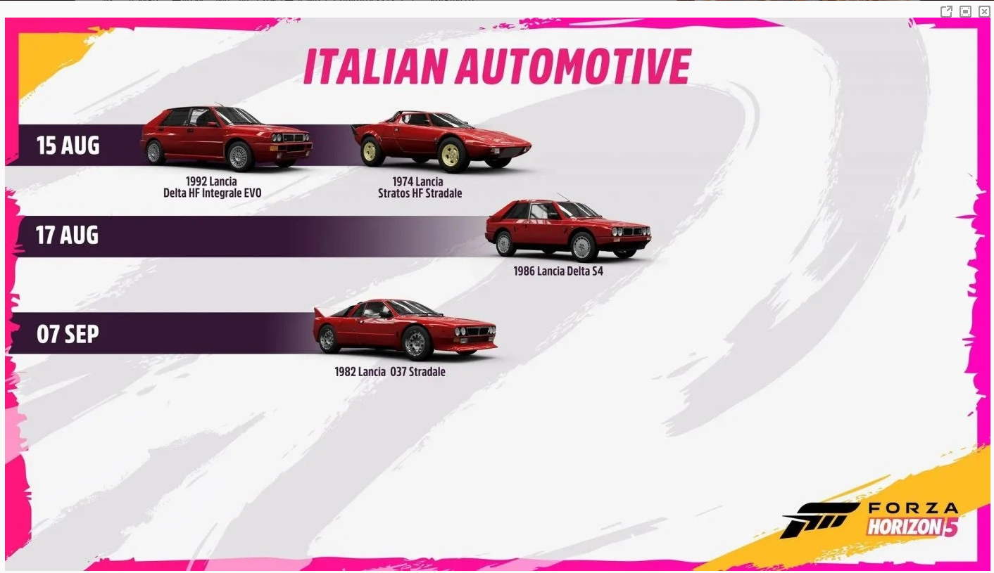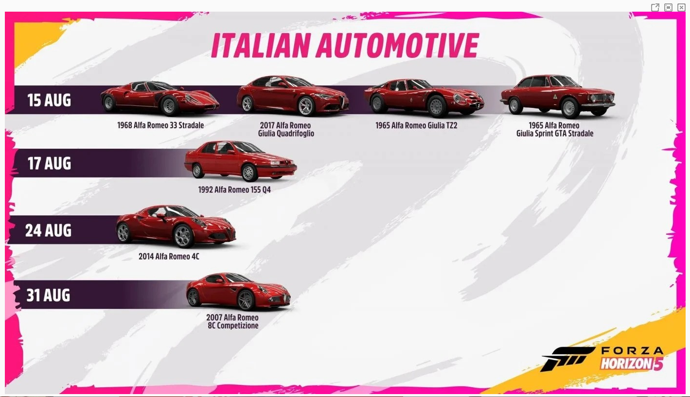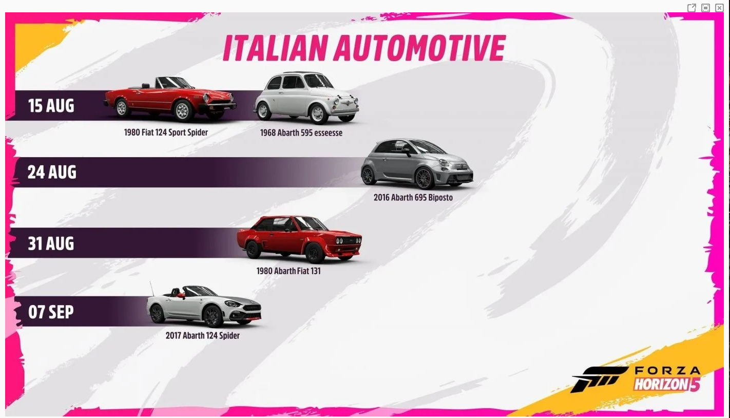 Playground Games宣布,《极限竞速:地平线5》将推出意大利汽车补充包,补充包内包括阿尔法罗密欧、菲亚特、蓝旗亚、阿巴斯等知名意大利汽车品牌的多款车型。如图所示: