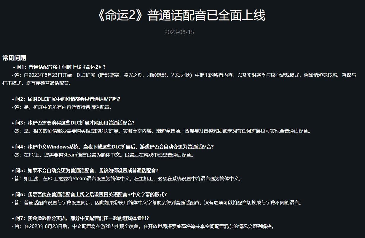 近日,《命运2》在官网更新公告,宣布《命运2》的普通话配音将于8月23日全面上线,这项更新将涵盖游戏本体以及所有DLC扩展内容。