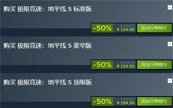 同时,在这个限时免费试玩周里,Steam上地平线5的所有版本都将享受五折优惠!原价248的标准版,现在只需124元!原价309的豪华版仅需154元!原价389的顶级版更是只需194元!