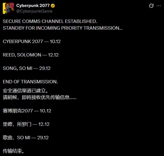 根据Insider Gaming的报道,《赛博朋克2077》官方近日发布了一条充满暗示的动态,暗指将在2025年12月10日(恰逢游戏五周年之际)披露重要信息。该推文虽未明确说明具体内容,却通过委婉的表达提及了几个值得玩家留意的日期。