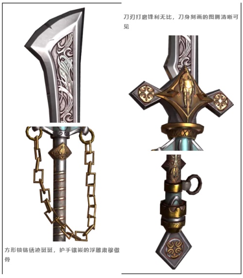 西方传奇武器商人怀克尔,为了挽救自己濒临破产的商会,忍痛卖出这把兼容东西方风情的关刀。据传他是从霍克哈尔手中巨资买下这把武器,列在收藏室中。根据学者鉴定,这柄武器可能来自王城,但其历史可能要追溯到王城初建的时期。